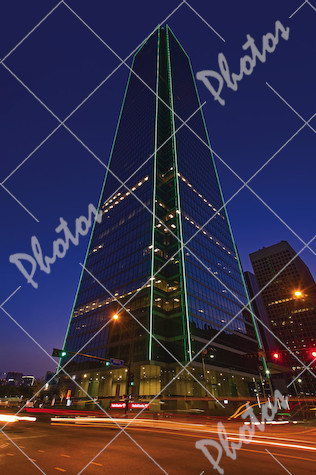 A 72-story, late-modernist skyscraper in the Main Street District of Downtown Dallas, Bank of America Plaza is the tallest skyscraper in the city, the third tallest in Texas and the 22nd tallest in the United States. Completed in 1985, the building’s outline is accented at night along all of edges by green argon lighting, informally making it known as “The Green Building. Originally one tower of a four-tower plan, its twin would have been illuminated in purple. The top two floors of the Bank of America Plaza function as a broadcast communications tower, and all point-to-point microwave and fixed-service antennae are concealed within glass communications parapet on the top floor.